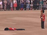 A guardsman collapses on Horse Guards Parade ahead of the Trooping the Colour parade to mark the Queen's official 90th birthday.