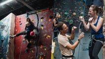 Footage of a man proposing to his girlfriend as soon as she lands a skydive.