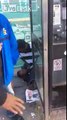 Trash Bag Rips Open Spilling Garbage Over Another Person When Man Tries to Fling It in Bin