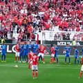 O árbitro avisou os jogadores duas vezes e à terceira o brasileiro LUISÃO foi mesmo para junto dos seus colegas, chamou a atenção para si e a barreira desfez-se.