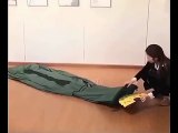 A woman easily inflates a sleeping bag using Bernoulli's principle