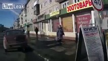 RAW Pedestrian crossing road throws beer bottle at approaching car