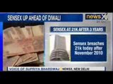 Sensex rises above 21000 for first time since November 2010. For more info log on to: www.youtube.com/abpnewsTV.