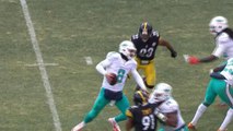 Pittsburgh Steelers defensive end James Harrison sacks New York Giants quarterback Eli Manning for a nine-yard loss.