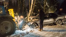 En Russie, un conducteur de tracteur tente de venir en aide à un véhicule tombé dans un fossé. Pour cela, il attache l’avant de la voiture à son tracteur et commence à avancer doucement.