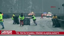 Tem Otoyolu'nun İstanbul yönü, Bolu Dağı Tüneli çıkışında kar yağışı nedeniyle kayan TIR'ın bariyerlere çarpması sonucu meydana gelen kaza nedeniyle ulaşıma kapandı. Haber