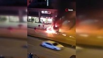 Bursa'da araç alev aldı, esnaf yangın tüpleriyle koştu