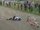 This is the crash that occurred at the sprint finish of the Cat 3 Santa Barbara Road Race.This year's finish was DANGEROUS as the finish had us sprinting over a bridge that was about 30 ft to the dry creek bad below.One guy was extremely lucky that he was able to remain aware, as he's tumbling around, and grab on the retaining wall to keep from falling. So scary!