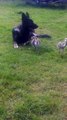 Fite and Alma are baby rheas (birds in the emu family) that enjoy some playtime in the garden. They're able to run around carefree because they have Thorin the German Shepherd there to protect them from any predators in the area!