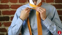 One should fasten a necktie so that the front falls just at the waist, then thread