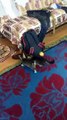 Un jeune homme joue au jeu de la Tarte à la crème (Pie Face Showdown) avec son chat. Même si ce dernier perd logiquement la partie, il y a fort à parier qu'il apprécie fortement la présence de la crème sur son petit museau. :)