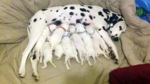 Dalmatian mom nurses 11 hungry puppies