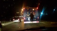 İstanbul Bahçeşehir’de bir kişinin otobüsün arka tamponuna çıkarak yaptığı ölümüne yolculuk kameralara saniye saniye yansırken, bu durumu gören vatandaşların yüreği ağzına geldi http://www.cumhuriyet.com.tr/video/video_haber/689621/Olumune_bedava_yolculuk_kamerada.html