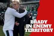 Tom Brady gets hugged by an Eagles defender who beat him in Super Bowl LII