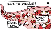Dans le tissu pulmonaire (en rouge), de grosses cellules issues de la moelle osseuse, appelées mégacaryocytes (en vert) donnent naissance aux plaquettes qui permettent au sang de coaguler (univ. de Californie).