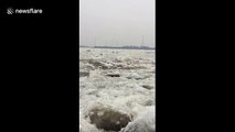 The video, filmed in Heilongjiang Province on April 29, shows large chunks of ice flowing down the river, producing spectacular scenes.