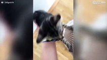 Slapend katje valt van bed
