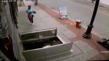 Shocking moment woman, 67, distracted by her phone suffers serious injuries when she plunges through an open sidewalk