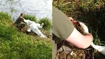 The footage, shot on July 18 in Guangyuan City, Sichuan Province, shows the anglers untying the life belts from the drones before they can be brought to safety on a speedboat.