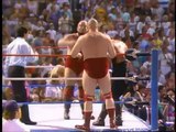 The Hart Foundation (Bret the Hitman Hart and Jim the Anvil Neidhart) take on the Powers of Pain (The Warlord and The Barbarian) with Mr. Fuji. (Prime Time .