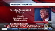 The President's office confirmed Wednesday morning that he will be holding a rally at 7 p.m. at the Phoenix Convention Center on Aug. 22, 2017.