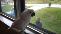 Un cacatoès très excité de voir son maitre dans la fenêtre lorsqu'il rentre à la maison !