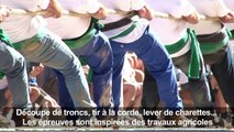 Lever de charrette, de bottes de paille ou de sac de blé, découpe de troncs de 30 cm de diamètre, tir à la corde: en pantalon bleu de chauffe et chemise blanche, 120 colosses s'affrontent sur le fronton de Saint-Palais (Pyrénées-Atlantiques) pour le 67e festival de "force basque". IMAGES ET SONORES 00:59