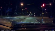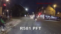 Cyclist ambles through a junction (ignoring the cycle path) oblivious to both the red light and the car that is coming out on green.