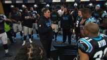 Carolina Panthers head coach Ron Rivera emphatically addresses his team after their dramatic Week 4 win over the New England Patriots.