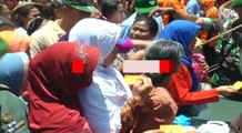 Balita dan ribuan warga harus berdesakan demi mendapatkan paket sembako gratis yang dibagikan prajurit TNI dalam memperingati HUT ke-72 TNI.