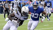 Los Angeles Chargers running back Melvin Gordon rushes for 16 yards and a first down on a cut back move.