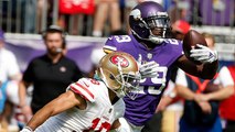 Minnesota Vikings cornerback Xavier Rhodes reaches out with one hand for an interception off a tipped pass thrown by Green Bay Packers quarterback Brett Hundley