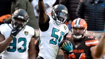 Jacksonville Jaguars linebacker Myles Jack explodes through protection to sack Indianapolis Colts quarterback Jacoby Brissett.