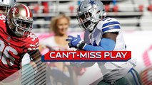 Dallas Cowboys running back Ezekiel Elliott darts through defenders and spins into the end zone for a 25-yard TD.