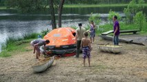 Piepūšamā glābšanas plosta izpakošana. Inflatable liferaft in hard-shelled canister, unpacking.
