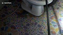 A woman was stunned when she went to the bathroom and found a one-metre long SNAKE hiding in the toilet bowl and called rescuers in Rayong, Thailand, on April 20.