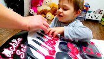 Toy kitchen set for kids. Little boy unboxing and cooking eggs .