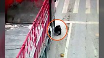 중국에서 대형 트럭과 충돌한 오토바이 운전자가 가까스로 살아남았습니다.
