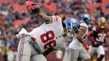New York Giants quarterback Geno Smith connects with tight end Evan Engram in tight coverage and runs for 29 yards.