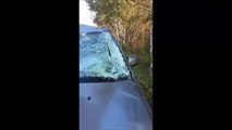Info from Licensor: "My fiancee and I were headed to a dinner party function and came to a traffic light on a major road in Sudbury. We noticed a female cow moose coming our way and let's just say we were thankful that the infamous moose chose to jump on the cop car rather than our new van before she took off."