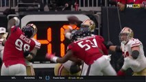 San Francisco 49ers quarterback Jimmy Garoppolo threads the needle on a pass to wide receiver Kendrick Bourne for a first down and gain of 12 yards.
