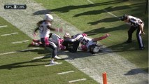 Los Angeles Chargers safety Tre Boston intercepts Oakland Raiders quarterback Derek Carr on a deep pass in the end zone.