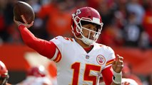 Kansas City Chiefs quarterback Patrick Mahomes nearly rushes in a goal line touchdown but steps out of bounds.
