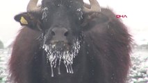 Türkiye'nin en soğuk yerleşim yerlerinden Van'ın Çaldıran ilçesinde mandalar, Kaz Gölü Çayı'nın zeminindeki taze otlarla besleniyor.