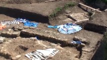 Açılan çukurda inceleme yapan ekipler, zeminde, üzerinde balık ve kuş figürleri bulunan 4-5 metrekare genişliğinde tarihi eser niteliği taşıdığı değerlendirilen mozaik yapı ile kalp şeklinde 80 santimetre çapında lahit olduğu değerlendirilen sütun taş tespit etti.