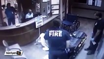 Polis nezaretinde evin kapısını kurtarma çalışmalarında kullanılan demir kesme ve ayırma makinesi yardımıyla açan itfaiye, yerden kalkamayan Polat'ın yardımına koştu.
