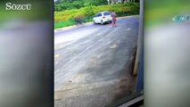 Kaza, Güneydoğu Asya ülkesi Tayland’da meydana geldi. Üzerinde 2 kişinin bulunduğu motosiklet, dönüş yapan kamyonete çarptı. Kazanın etkisiyle motosiklet sürücüsü taklalar atarak metrelerce savrulurken, arkasındaki de kamyonetin üstünde kaldı. O anlar araç kamerasına yansıdı.
