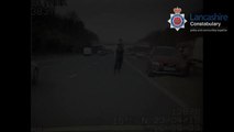 The video also captures a police car giving chase at high speed, travelling in the right direction of the motorway. It appears at 15 seconds into the video, under the bridge.