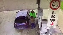 Une femme fait n'importe quoi à la pompe à essence
