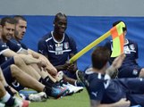 Balotelli clowns around with a corner flag